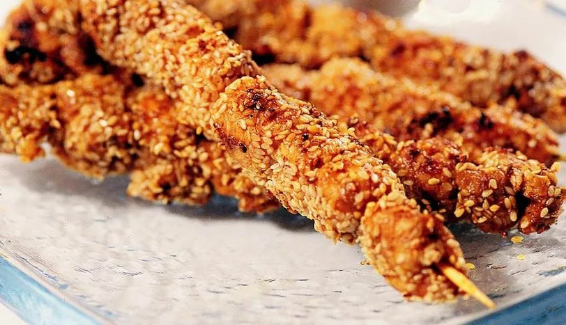 Tavukları kuşbaşından iri doğrayın. Dövülmüş sarmısak, zeytinyağı, bal, soya sosu, kırmızı tozbiber, karabiber ve köriyi karıştırın. Tavukları bu marinatta buzdolabına alarak 1 gün bekletin. Ertesi gün şişlere dizin. Üzerlerine bol susam serpip, ızgarada ya da fırında pişirin.