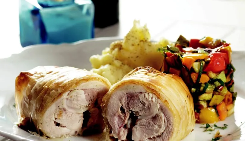 Tavuk butlarını sarmısak, fesleğen ve zeytinyağı ile marine edin. Zeytinyağını kızgın tavaya alın. Küçük doğranmış renkli biberler, kuru soğan ve dolmalık fıstığı zeytinyağında soteleyin. Sotelenen harcı tavuk budunun içine koyup rulo şeklinde sarın (derili kısmı dışa gelecek şekilde). Önceden ısıtılmış 180 derecelik fırında 15 dakika pişirin. Fırından çıkarılıp soğumasını bekleyin. Tavuk butları soğuduktan sonra, üzerlerine tereyağı sürülmüş baklava hamurunu sarıp, tekrar fırına verin. Hamurun üzeri kızarana dek pişirin. Dilerseniz haşlanmış sebze ile servis yapın.