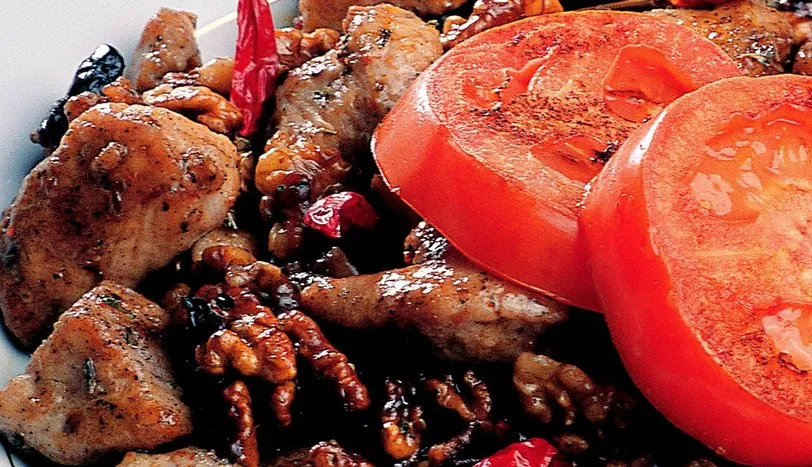 Ceviz içini derin bir kaseye alın. Üzerine çıkacak kadar su ilave edip 2 saat bekletin. Daha sonra süzüp kurumaya bırakın. Yumurtanın akı, mısır nişastası, tuz, karabiber, köri ve tozşekeri çırparak hindi etini bu marinatta 1 saat dinlendirin. Tereyağ ve sıvıyağı tavaya alarak cevizleri kavurun. Cevizlerin yağını kevgirle süzdürerek tabağa alın. Ardından marinatlı hindi etini tavaya alın. Eti iyice pişip yumuşayana dek soteleyerek kavurun. Ocaktan almaya yakın soyu sosunu, toz kırmızıbiberi ve kekiği ilave edin. Ateşten alarak servistabağına yerleştirin. Domateslerin kalınca dilimleyip sıvıyağında hafifçe kızartın. Hindi etinin yanında cevizlebirlikte servis yapın.