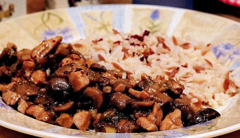 TAVUK göğsünü küp biçiminde doğrayın. Mantarları da irice doğrayın. Soğanı incecik kıyın. Tavuk etini sıvıyağda kavurun. Ayrı bir kapta soğan, soya filizi ve mantarları kavurun. Daha sonra malzemeyi birleştirip, baharat, kesmeşeker ve tuzu katın. Karıştırıp sıcak servis yapın.