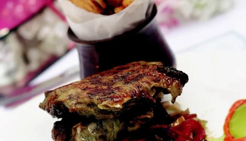 TAVUĞUN içini açın. Elma, fesleğen, sarmısak, zeytinyağını robotta karıştırın. Hazırladığınız sosu tavuğun içine koyup, orta ısılı fırında pişirin. Sırasıyla incecik doğranmış havuç, kırmızı lahana, beyaz lahana, kabak ve kırmızı biberi tavada soteleyin. Diğer taraftan patatesleri kızartın. Sebzeyi tabağa, tavuğu ise üzerine koyun. Patatesleri yemeğin yanında servis yapın.