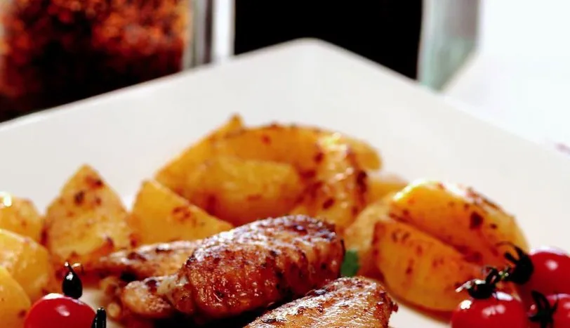 Tavuk kanatlarını ocakta tütsüledikten sonra yıkayıp süzün. Patatesleri soyup elma dilimi şeklinde doğrayın. Geniş bir kaba alıp üzerine sıvıyağ gezdirin. Tuz, toz kırmızıbiber, karabiber ve pulbiber serpip iyice karıştırın. Patatesleri süzerek kaptan alın ve yağlı kağıt serilmiş fırın tepsisine yerleştirin. Tavuk kanatlarını kapta kalan baharatlı karışıma bulayın. Tavukları da tepsiye alın. Önceden ısıtılmış 180 derece fırında tavuklar kızarana kadar pişirip servis yapın.