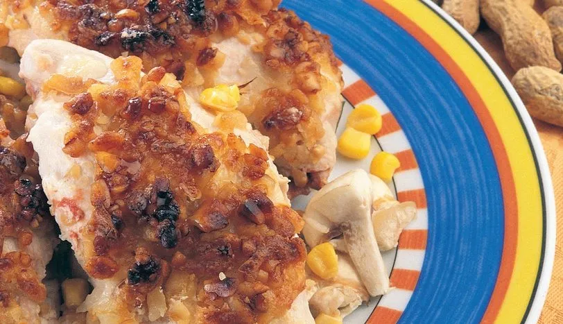Tavukgöğüslerini havan tokmağı ile dövüp, iyice inceltin. Mantar ve soğanı küçük doğrayın. Soya sosu, köri ve yerfıstığını karıştırın. Tuzunu ayarlayın. Hazırladığınız malzemeyi göğüslerin bir kenarına koyup, diğer kenarını üzerine kapatın. Kürdanla tutturun. Dövülmüş yerfıstığı, rendelenmiş kaşar peyniri ve sütü karıştırın. Tavukları bu karışıma bulayın. Önceden ısıtılmış 200 derece fırında üzeri kızarana dek pişirin.