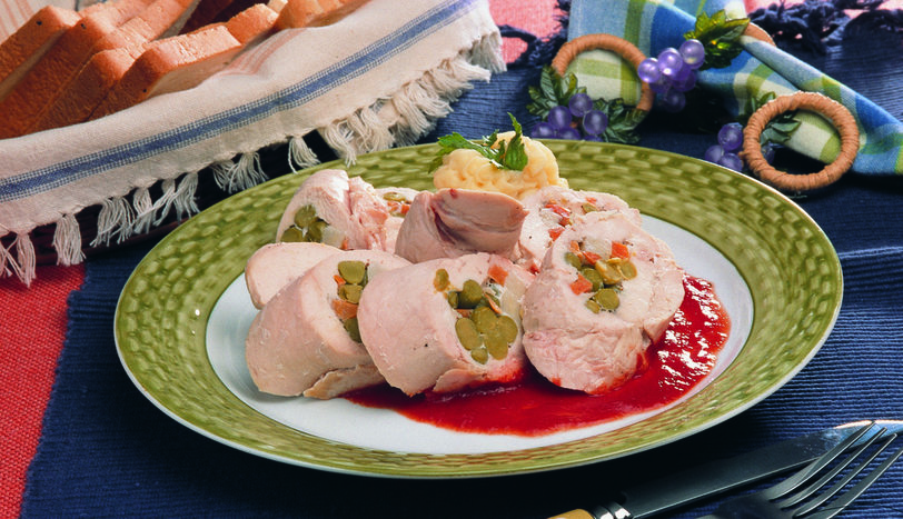 TAVUK göğüslerinin üzerine, tuz ve karabiber serpip garnitürleri tavuğun kenar kısmına yerleştirin. Tavuk göğsünü rulo şeklinde sarın. Sardığınız bu tavuk göğsünü alüminyum folyo kağıdı ile kaplayın. Kenarlarını da sıkarak, her tarafının iyice kapalı olmasına dikkat edin. Tencerede bol su kaynatıp, alüminyum folyoya sarılmış tavukları bu suda haşlayın. Haşlama esnasında içine tuz, zeytinyağı ve sarmısağı ilave edin. Sonrasında haşlanmış tavukları folyodan çıkartıp dilimleyerek servis tabağına aktarın. Arzuya göre ketçap veya salçalı sosla servis yapın.