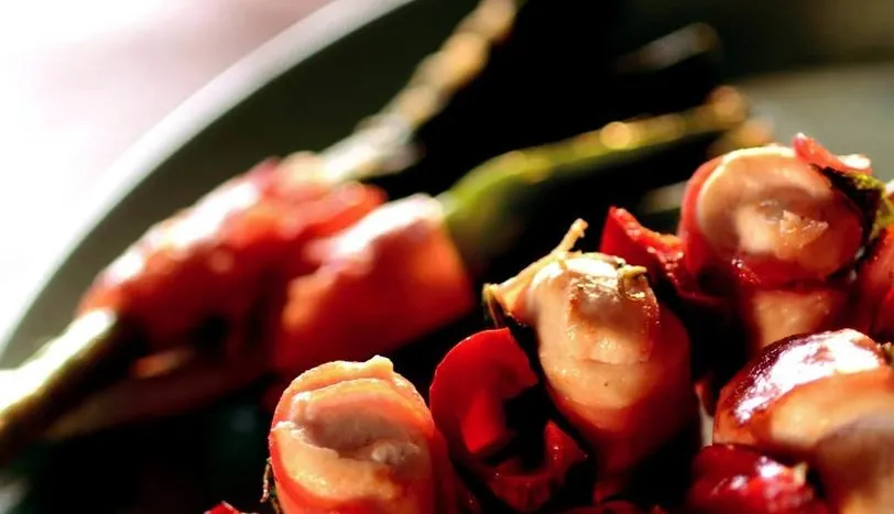 TAVUK etini hafifçe dövüp, 2 cm'lik şeritler halinde kesin. Düz bir zemine bir adet hindi pastırması serip, üzerine bir parça tavuk koyun. 4-5 cm uzunluğunda kesip rulo yapın. Tavuk eti bitene kadar aynı işlemi sürdürün. Kırmızı biberleri boylamasına kesip 2-3 cm'lik parçalar halinde doğrayın. Daha sonra çöp şişlere 3'er adet pastırmaya sarılmış tavuk, biber ve adaçayı geçirin. Kızartıp kağıt havluya çıkarın ve tuzlayın. Diğer taraftan, yumurtayı unla çırpıp tuz ekleyin. Yeşil kısımlarını 2 parmak uzunluğunda kestiğiniz soğanların orta kısımlarına pastırma sarın. Kızartıp, pastırmalı tavuk şişlerle birlikte servis yapın.