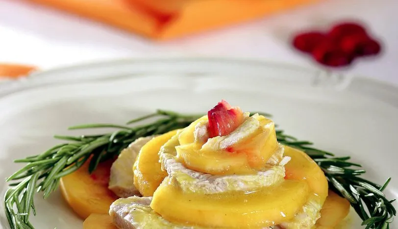 HİNDİ göğsünün üzerine tuzu serperek iki kat alüminyum folyoya sarın. Tencereye suyu alarak kaynatın. İçine hindi göğsünü yerleştirerek kısık ateşte 20 dakika pişirin. Paketi alt-üst ederek 10 dakika daha pişirin. Hindi göğsünü tencereden alarak 5 dakika dinlendirin. Daha sonra buzdolabının alt rafında dinlenmeye bırakın. Sosu hazırlamak için limon suyu, sirke, hardal, karabiber ve bir tutam tuzu iyice karıştırın. Ayçiçekyağını damla damla ilave ederek çatalla çırpın. Zeytinyağını da aynı şekilde ilave edin. Şeftalileri kabuklu olarak ortadan ikiye keserek çekirdeklerini çıkarın. İnce dilimleyerek bir kaseye alın. Üzerine hazırladığınız sostan 3 çorba kaşığı gezdirerek buzdolabına kaldırın. Buzdolabından hindi göğsünü alarak alüminyum folyoyu çıkartın. 5 mm kalınlığında dilimleyin. Servis tabağına marul yapraklarını yerleştirin. Üzerine hindi göğsünü ve buzdolabından çıkardığınız şeftali dilimlerini gül şeklinde dizin. Üzerine kalan sosu gezdirerek servis yapın.