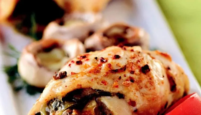 ISPANAK yapraklarını yıkayın ve iri doğrayın. Zeytinyağını tavaya alıp, içine ıspanak, kıyılmış taze soğan, sarmısak, tuz, karabiber ve pulbiber katın. 1-2 dakika soteleyin. Soğuduktan sonra rendelenmiş kaşar peynirini katın ve karıştırın. Tavuğu marine etmek için, derin bir kaba zeytinyağı, sarmısak, kekik, yoğurt suyu, tuz ve pulbiber koyup, karıştırın. İçine tavuk göğüslerini yerleştirin ve bu sosun içinde 1 saat bekletin. Daha sonra tavuğu düz bir zemine alın. İçine ıspanaklı harçtan koyun ve rulo yapın. Diğer tavuk etlerini de aynı şekilde hazırlayın ve yağlı kağıt serilmiş fırın tepsisine yerleştirin. Önceden ısıtılmış 200 derece fırında üzerleri kızarana kadar pişirin. Mantarla birlikte sıcak olarak servis yapın.