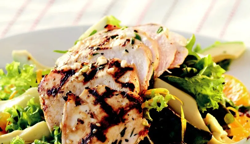 1 TAVUK göğsü için zeytinyağı, ince kıyılmış arpacık soğan, tarhun, limon suyu, portakal suyu, tuz ve karabiberi geniş bir kaba alıp harmanlayın. Tavuk etlerini ilave edip buzdolabında 2 saat dinlendirin. Daha sonra barbekü ızgarasının düşük ateş bölümüne önce saat 5 yönünde yerleştirip 3 dakika işirin. Ardından saat 7 yönüne çevirip 3 dakika pişirin. Tavukların diğer taraflarını çevirip önce saat 5 yönünde 3 dakika sonra saat 7 yönünde 3 dakika pişirip ızgaradan alın.