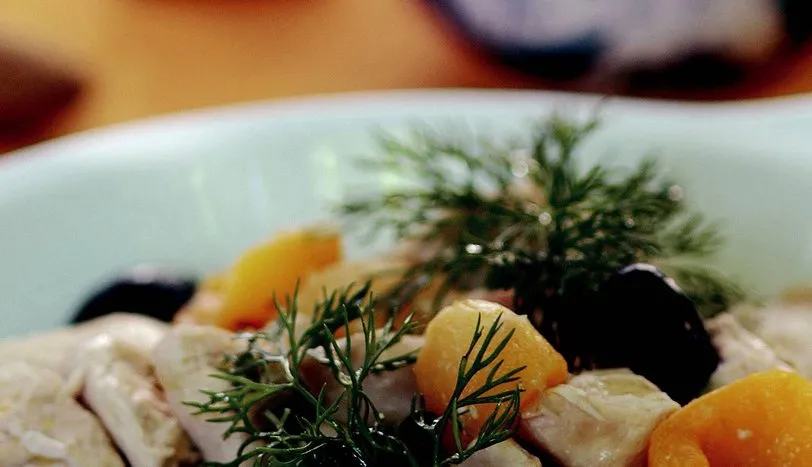 Pilicin kemiklerini ayırın, etini küp şeklinde doğrayın. Derin bir tencerede 1 çorba kaşığı tereyağını eritip eti hafifçe kızartın. Üzerine ince kıyılmış soğanı ilave edip, 2 dakika kavurduktan sonra balı, üzüm ve bademlerin yarısını, kayısıyı, limon suyunu, tuz ve suyu ekleyin. Tencerenin kapağını kapatıp, ağır ateşte30 dakika pişirin. Ocaktan alıp tarçını serpin ve servis tabağına alın. Kalan tereyağını ayrı bir tavada eritin. Badem ve üzümlerin kalanını tereyağında soteleyin ve etin üzerine dökün. Dereotuyla süsleyip servis yapın.