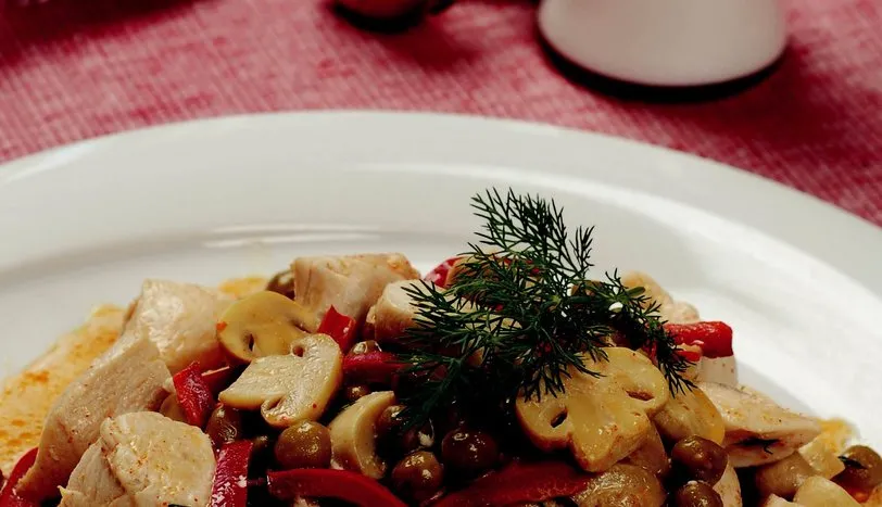 Öncelikle tavuk etini kuşbaşı doğrayın. Tereyağını bir tavaya alıp eritin. Tavuğu üzerine ekleyip, toz kırmızıbiber serpin ve kavurun. Şerit şeklinde doğradığınız kırmızı biberleri ilave edip, 1-2 dakika daha kavurun. Doğranmış mantar, bezelye ve tuz ekleyin. 10 dakika pişirip kremayı katın. Şöyle bir çevirip ocaktan alın. Arzunuza göre dereotu ile süsleyerek servis yapın.