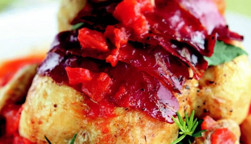 Tavuğu ocakta ütüledikten sonra yıkayın ve fırın tepsisine yerleştirin. Üzerine küçük parçalar halinde kestiğiniz tereyağı parçaları koyun. Sarmısakları bütün olarak içine yerleştirin. Önceden ısıtılmış 210 derece fırında arada bir kontrol ederek kızarana kadar pişirin. Üzerine pastırmaları sıralayın ve 10 dakika daha pişirin. Fırından alın ve servis tabağına yerleştirin. Üzerini defne yaprağı ve biberiye ile süsleyin. Domates sos için kabukları soyulmuş ve küp doğranmış domates ve sarmısağı sıvıyağda soteleyin. Üzerine ince kıyılmış sivri biberi ekleyin ve 1-2 dakika daha pişirin. Tavukla birlikte sıcak servis yapın.