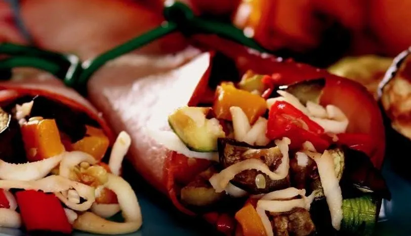 Hindi fümeleri ızgara yapın ve bir kenara alın. Kabak ve patlıcanın kabuklarını soyup yuvarlak şekilde dilimleyin. Patlıcanların acısının çıkması için 20 dakika tuzlu suda bekletin. Suyunu süzüp kurulayın. Kabak, patlıcan, sarı ve kırmızı biberi ızgara yapın. Sebzelerin bir kısmını küp şeklinde doğrayıp, rendelenmiş light kaşar peyniri ile karıştırın. Hindi fümelerin içine iç harcı paylaştırıp her iki ucunu üst üste gelecek şekilde kapatarak maydanoz sapı ile bağlayın. Hazırladığınız ruloları kalan ızgara sebzelerle birlikte servis yapın.