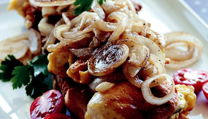 4 Servis tabağına önce ekmekleri yerleştirin. Üzerine tavuk parçalarını koyun. En üste soğanlı karışımı gezdirip servis yapın.