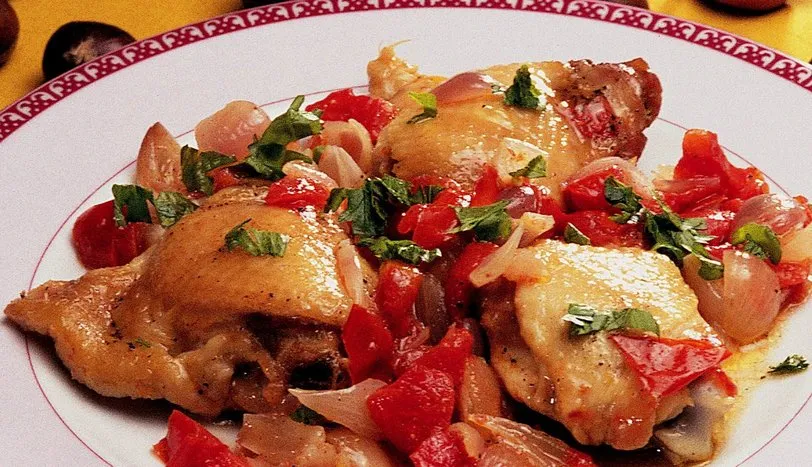 Tencereye kuşbaşı doğranmış tavukları, yağı, tuzu ve karabiberi alıp, iyice harmanlayın. Üzerine 4'e bölünmüş arpacık soğanları, küçük küp doğranmış domatesleri veya salçayı, sirkeyi, ince kıyılmış maydanozu, kimyon ve suyu ekleyip, tencerenin kapağını sıkıca kapatın. Önce harlı ateşte, kaynamaya başlayınca da kısık ateşte, tencerenin kapağını açmadan 30 dakika pişirin. Suyu ile birlikte sıcak olarak servis yapın.