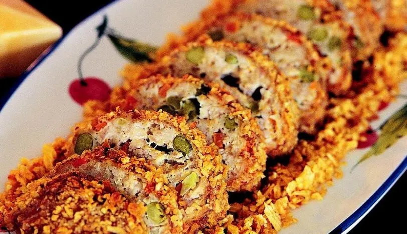 Tavuk kıymasını bir kaba aktarın. Üzerine 2 adet yumurta sarısını,bezelyeyi, küp doğranmış havucu, tuzu ve karabiberi ekleyip malzemeyi iyice yoğurun. Yoğurduktan sonra tavuklu harca silindir şekli verin. Cipsi incecik kıyın ve tavuklu harcı cipse bulayın. Dikdörtgen tepsiye koyup 180 derece fırında 30 dakika pişirin. Fırından çıkarıp soğutmadan dilimleyerek servis yapın.