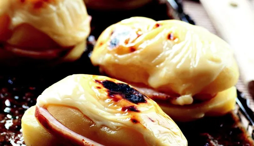 PATATESLERİ tuzlu suda haşlayın. Kabuklarını temizleyip, enlemesine ortadan ikiye kesin. Aralarına birer dilim füme tavuk yerleştirin. Üzerlerine kaşar peyniri koyup, fırının ızgara bölümünde peynir eriyene dek pişirin. Sos için, domates, maydanoz, dereotu, soğanın yeşil kısımları ve tuzu blenderden geçirin.Sosu servis tabağına yayın. Üzerine patatesleri yerleştirip servis yapın.