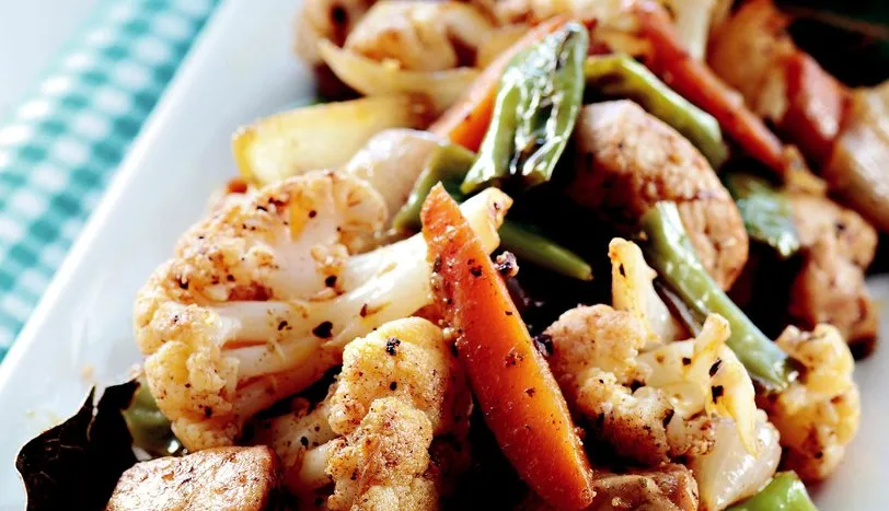 1 KARNABAHARI çiçeklerine ayırıp, tuz ve limon suyu eklenmiş suda 6-7 dakika haşladıktan sonra süzün. Bir tavaya tereyağı ve sıvıyağı alıp kızdırın. Tavaya sırasıyla baharatları, karnabaharı, şekeri ve acı biber sosunu katın. Tuzunu ayarlayın. Karıştırarak rengi pembeleşene dek soteleyin ve kenara alın.2 Tavuklu sebze için, biberleri irice, havucu verev doğrayın. Soğanı 8'e bölün. Kereviz saplarını küp doğrayın. Sarmısakları temizleyin ve üzerine bastırıp hafifçe ezin. Tereyağını bir tencereye alın. Üzerine tavuk ve soğanı ekleyin. Tavuk suyunu salıp çekene dek soteleyin. Tencereye verev doğranmış havucu ekleyip,5 dakika kavurun. Sivri biber, kereviz sapı ve sarmısakları katıp, 10 dakika soteleyin. Tuz, karabiber,pulbiber, kekik, kimyon ve defne yaprağını ilave edin. Sebzelerin üzerine sıcak su katın ve tencerenin kapağı kapalı olarak 15 dakika pişirin. Karnabaharlı karışımı üzerine ekleyin. Birlikte 5 dakika pişirip, servis yapın.