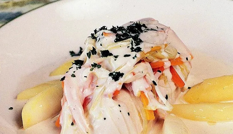 Tavuk göğsünü bir litre tavuk suyunda 30 dakika pişirin. Sebzeleri jülyen doğrayıp (kibrit çöpü inceliğinde), bir bardak tavuk suyunda haşlayın. Haşlama suyunun üzerine krema, tuz, karabiber ve muskat ekleyerek pişirin. Haşladığınız tavuk etini büyük parçalara ayırarak, servis kabına koyun. Hazırladığınız kremalı sebzeleri suyuyla beraber ekleyin. İri doğranmış ve haşlanmış patatesi ekleyip, kıyılmış maydanozla servis yapın.