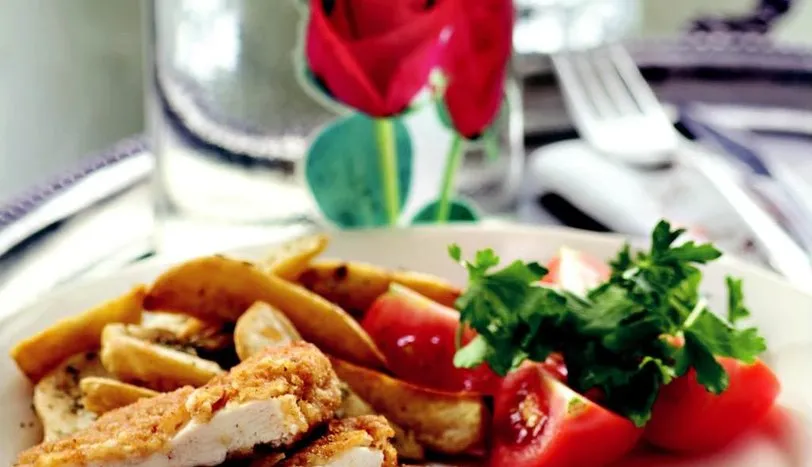 PANE için un, süt ve tuzu iyice karıştırın. Tavuk göğüslerini önce pane harcına, sonra galeta ununa bulayın. Kızgın sıvıyağda önlü-arkalı kızartın. Sıcak olarak, yanında elma dilimi patates ile servis yapın.