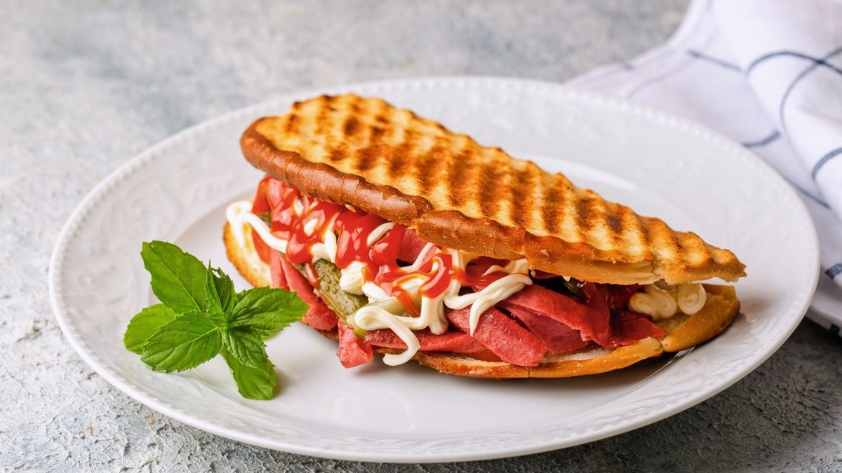 Tost ekmeklerinin iç kısımlarını tereyağı ile hafifçe yağlayın. Ekmek dilimlerinden birinin üzerine ince dilimlenmiş sucukları yerleştirin. Üzerine salam dilimlerini ekleyin. Salamların üzerine dilimlenmiş kaşar peynirini koyun. Kaşar peynirinin üzerine Rus salatasını, domates dilimlerini ve kornişon turşu dilimlerini yerleştirin.