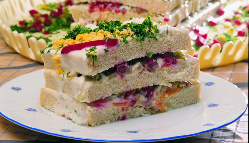 Üzerine çorba karışımından sürün. Sotelenmiş mantarlı malzeme ile küçük doğranmış kornişon ve pancar turşularını yayın. Üzerine tekrar tost ekmeği dizip aynı işlemi uygulayın.