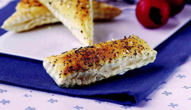 Baharatlı bir kaba alıp harmanlayın. Milföy hamurlarını yumuşayana kadar oda sıcaklığında bekletin. Daha sonra unlu zeminde, merdane yardımıyla iki katı büyüklüğe ulaşacak şekilde açın. Hamur kesme ruleti ile üçgen ve dikdörtgen parçalar şeklinde kesin.