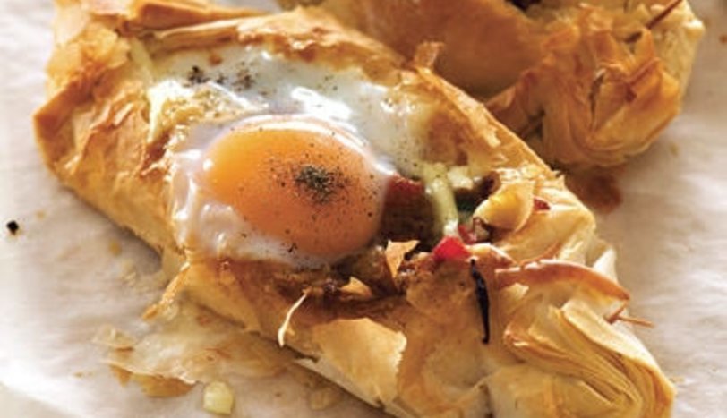 Kenarlarını dört parmak kalınlığında içe doğru katlayarak, bohça gibi yalnızca uçlarını kapatın. Açılmaması için kürdanla sabitleyin. Önceden ısıtılmış 180 derece fırında 10 dakika pişirin.