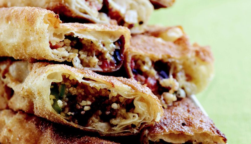 Yufkaları dörde bölün ve toplam 12 adet üçgen parça elde edin. Üçgen yufkanın geniş kısmına pastırmalı iç harçtan koyun ve sigara böreği sarar gibi sarın.