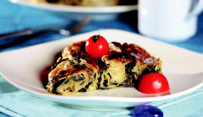 Diğer yufkaları da aynı şekilde hazırlayın ve tepsideki böreğin etrafına dolayın. Çırpılmış yumurtayı böreğin üzerine sürün. Önceden ısıtılmış 180 derece fırında 20 dakika pişirin. Sıcak olarak servis yapın.