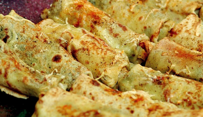 İçi için 1 yemek kaşığı unu, margarinde kavurun. Ayrı bir yapışmaz yüzeyli tavada, küp kesilmiş soğan ve kıyılmış ıspanağı, yağsız olarak soteleyin. Kavrulmuş unu ekleyerek karıştırın. Krepleri, hazırlanan harç ile doldurarak, kalınca sigara böreği gibi sarın. Önceden yağladığınız fırın kabına yerleştirin. Üzerlerine rendelenmiş kaşar peyniri ve pul biber serpin.Önceden ısıtılmış 150 derece fırında, peynir eriyene kadar ısıtın.