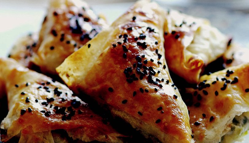 Yufkaların bir ucuna hazırladığınız iç malzemeden koyup muska şeklinde sarın. Börekleri yağlanmış fırın tepsisine dizin. Üzerlerine çırpılmış yumurta sarısı sürüp çörek otu serpin. Önceden ısıtılmış 180 derece fırında üzerleri kızarana kadar pişirin. Sıcak olarak servis yapın.