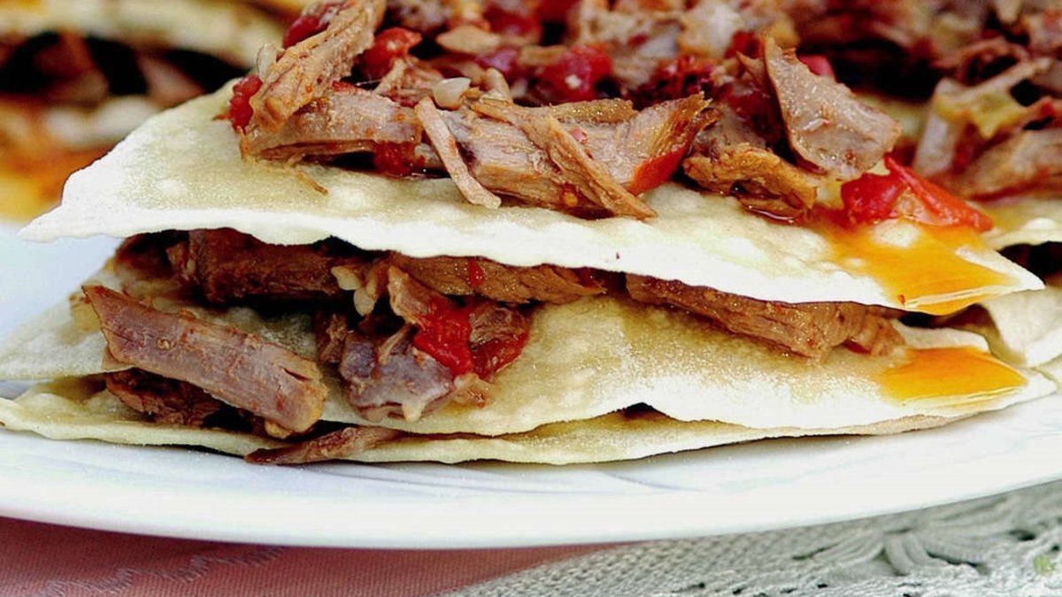 Eti, tuz, karabiber ve kesme şekeri ekleyip, 1-2 dakika daha kavurun. Harcı hamurların arasına yayın ve üst üste koyun. Dilimleyerek servis yapın. - 2