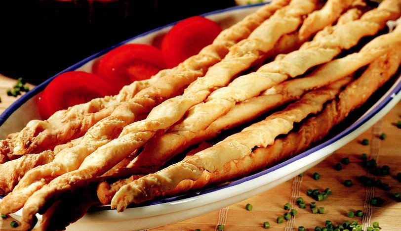 Birer parmak eninde şeritler kesin. Şeritlerin üzerine susam serpin ve her bir şeridi ip büker gibi büküp, yağlanmış tepsiye dizin (dilerseniz küçük küçük keserek, fiyonk şekli de verebilirsiniz). 200 derece fırında 20-25 dakika pişirin.