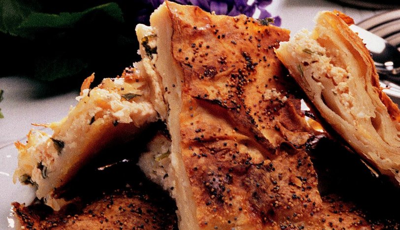 Üçüncü yufkayı da parçalayarak üzerine serin. Sütlü karışımdan gezdirin. Tepsi kenarından sarkan yufkayı bohça gibi üzerine kapatın. Kalan sütlü karışımı yayarak en üste haşhaş tohumu serpin. Önceden ısıtılmış 200 derece fırında üzeri kızarıncaya dek pişirin. Dilimleyip, Ilık olarak servis yapın.