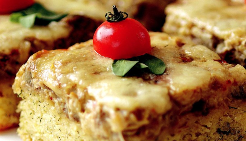 Önceden ısıtılmış 175 derece fırında 30-40 dakika pişirin. Tepsiyi fırından çıkarıp üzerine rendelenmiş kaşar peyniri serpin ve 5 dakika daha pişirin. Ilındıktan sonra dilimleyip, üzerini mercanköşk ve kiraz domatesle süsleyerek servis yapın.