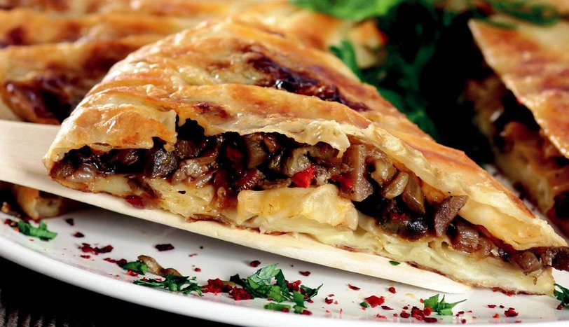 Kalan yarım yufka parçasını ve kalan harcı da aynı şekilde tavaya koyun. Kenarlarından sarkan parçaları pile pile büzerek toplayın ve böreğin üstünü kapatın. Ağır ateşte böreği arkalı önlü kızartın. Dilimleyerek servis yapın.