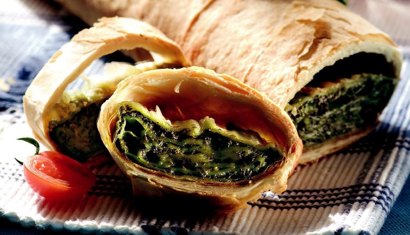 Soğumuş iç malzemeyi yufkanın bir ucuna boydan boya yayın ve kenarlarını içe doğru katlayıp, rulo yapın. Üzerine eritilmiş tereyağı sürün ve önceden ısıtılmış 190 derece fırında üzeri kızarana kadar pişirin. Dilimleyerek, sıcak olarak servis yapın.