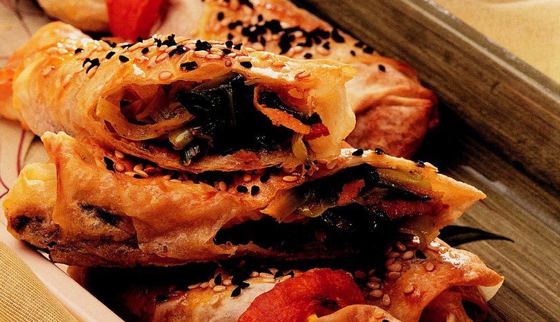 Yufkaların her birini, 8 adet üçgen oluşturacak biçimde kesin. Üçgenleri ikişer ikişer ayırın. Ayrı bir yerde, pırasaları kibrit çöpü biçiminde doğrayıp, 2 yemek kaşığı ayçiçek yağda kavurun. Havuçları ortadan ikiye bölüp, ince kısımlarını rendeleyin ve pırasaya ekleyin. Tuz ve kesme şeker ilave edin. Rendelenmiş patates, ıspanak, karabiber katıp, 1-2 dakika daham kavurun ve ocaktan alın. Soğumaya bırakın.