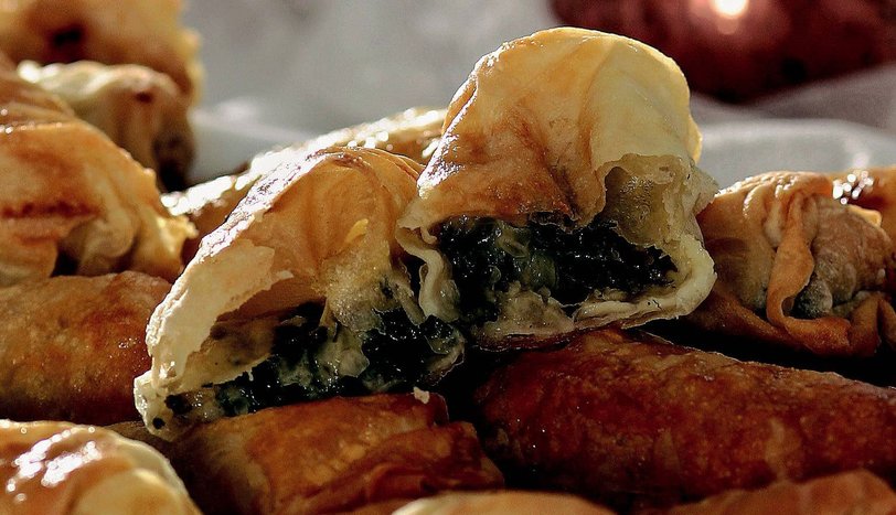 Bir adet yufkayı düz bir zemine serin. Fırça ile üzerine kalan zeytinyağından sürün. İkinci bir yufkayı yağlanmış yufkanın üzerine koyun. Daha sonra yufkayı dörde bölün. Elde ettiğiniz bu parçaların geniş tarafına ıspanaklı harçtan koyun. Kenarlarını hafifçe toplayarak dikdörtgen olacak şekilde sarın.