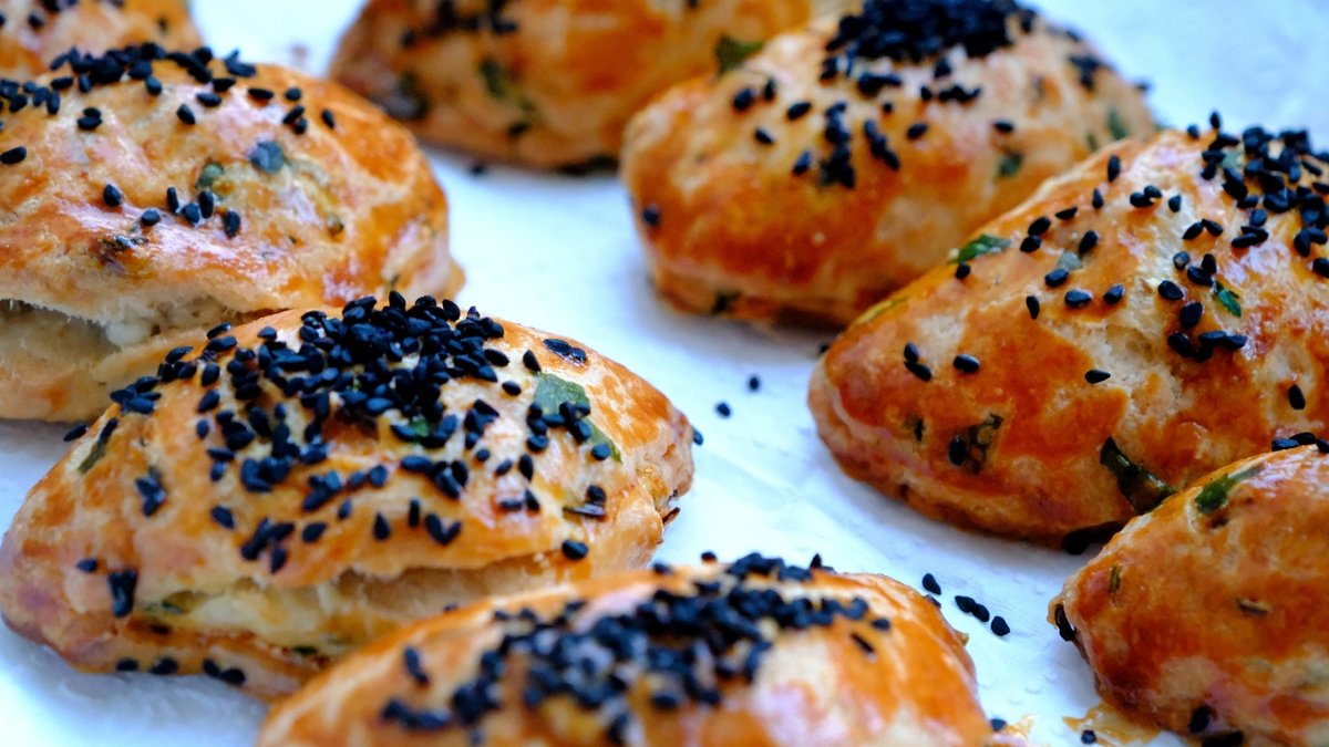 Kenarlarını iyice kapatıp, üzerilerine yumurta akı sürün. Susam ve çörek otu serpip, önceden ısıtılmış 180 derece fırında üzerileri kızarana dek pişirin. Servis yapın.