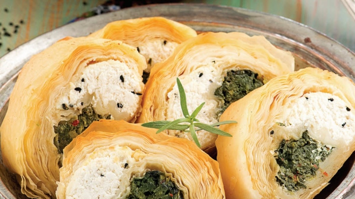 Tereyağını eritip, yarısını fırça yardımıyla yufkaların arasına sürün ve uzun tarafına ıspanaklı harcı uzun ince şekilde yayın. Daha sonra bir kez çevirip rulo yapın. Yanına peynirli harcı yine uzun ince şekilde yayın ve rulo yaparak sarın. Bir gece buzdolabında dinlendirin.