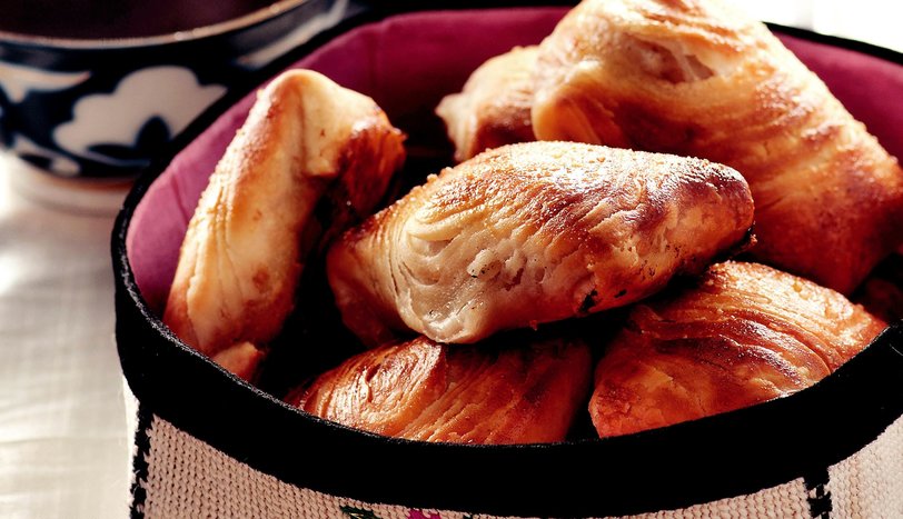 Hamur için un, yoğurt, su, kabartma tozu ve tuzu yoğurup, yumuşak kıvamlı bir hamur elde edin. İnce olacak şekilde açın. Üzerine eritilmiş tereyağı sürüp, rulo şeklinde sarın. İki parmak genişliğinde kesip, her bir parçanın ortası bombeli kalacak şekilde elinizle bastırın, daha sonra merdane ile inceltin.