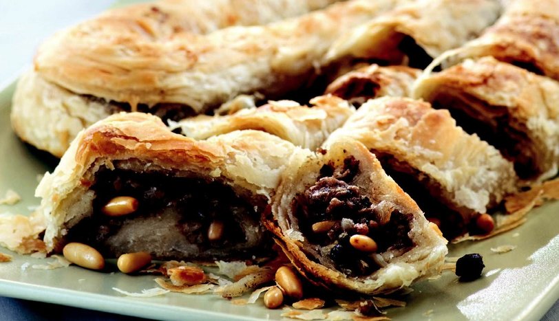 Soğuyan harcı 4'e ayırın ve açtığınız hamurların uzun kenarlarına paylaştırın. İç harçlı yufkayı rulo şeklinde sarın ve "S" şekli vererek yağlanmış tepsiye yerleştirin. Diğer hamurları da aynı şekilde hazırlayın. Önceden ısıtılmış 200 derece fırında üzerleri kızarana kadar pişirin ve dilimleyerek servis yapın.