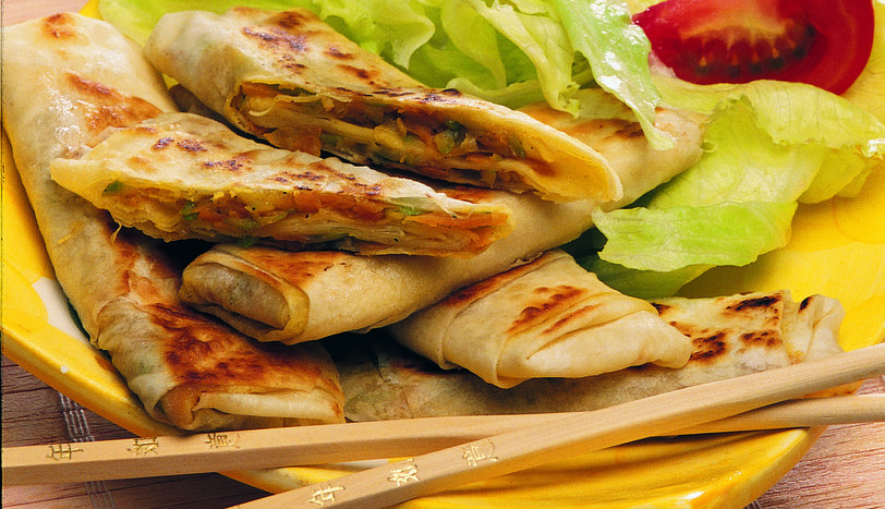 Bu arada yufkaları 8 eşit üçgene bölün. Soğuyan sebzeleri yufkanın geniş kenarına yayın. Geniş dikdörtgenler şeklinde sarın. Yapışmaz yüzeyli tavada çok az yağda (dilerseniz yağ kullanmayabilirsiniz) kızartın. Sos için 2 diş sarımsağı ezip, tüm malzemeyi iyice karıştırın. Böreklerle birlikte servis yapın.