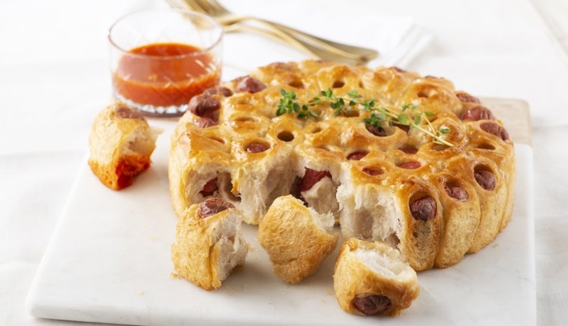 . Sosisi ortalarına yerleştirip rulo yapın. Sosisler üstte görünecek gibi dik olarak yan yana ve gevşek olacak şekilde kalıba yerleştirin. Kalan zeytinyağını üzerlerine sürün.