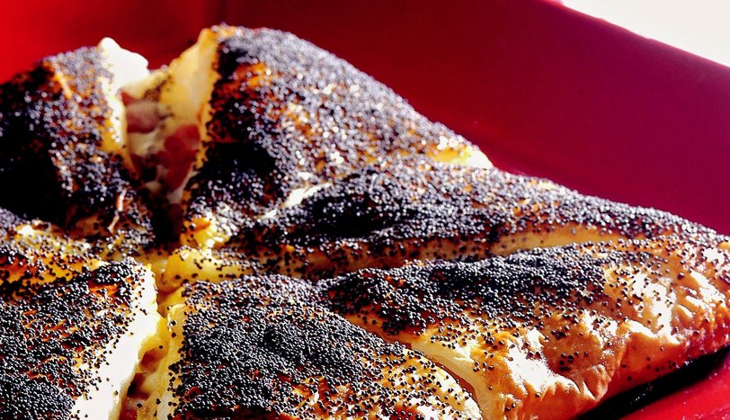 Birinci yufkayı yağlanmış kare fırın tepsisine, kenarları sarkacak şekilde serin. 1 çay bardağı su ve 3 çorba kaşığı zeytinyağını karıştırın. Karışımın yarısıyla yufkanın her yerini ıslatın. İkinci yufkayı diğer yufkanın üzerine yayın ve kalan karışımla ıslatın. Yufkaların sarkan kısımlarını ortaya doğru kapatarak kare şekil verin. Kare şeklindeki yufkanın dört kenarına rendelenmiş kaşar peyniri ve küçük doğranmış sosisleri koyun. Yufkanın dört ucunu ortaya doğru katlayın. Oluşan üçgen parçaları bıçakla ikiye bölün. Üzerine yumurta sarısı sürüp, haşhaş tohumu serpin. Önceden ısıtılmış 180 derece fırında 25-30 dakika pişirin.