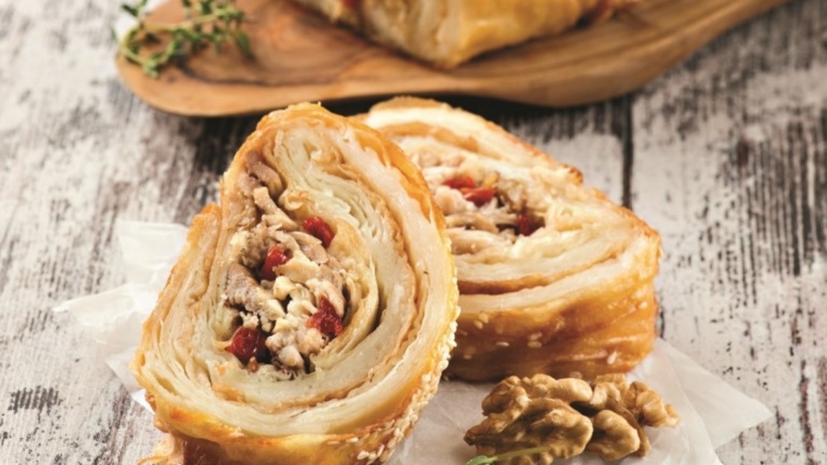 Fırından alıp 15 dakika kadar yufkanın ılınması için bekletin. Üzerine didiklenmiş tavuk, ceviz, kuru domates ve kaşar peynirini koyup rulo pasta sarar gibi sarın.