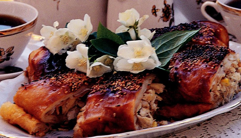Fırından çıkarınca, soğumuş tavuk suyunu üzerine gezdirin ve yumuşayıp suyu çekmesini bekleyin. Didiklenmiş tavuğa, tuz, karabiber ve mısır ekleyip karıştırın. Bu malzemeyi yufkanın ortasına yerleştirip, yufkayı rulo halinde sarın. Ruloyu, hafif yağlanmış tepsiye alın. Üzerine yumurta sarısı sürüp, susam serpin ve 200 derecede, kızarana kadar pişirin. Hafif soğuyunca dilimleyip servis yapın.