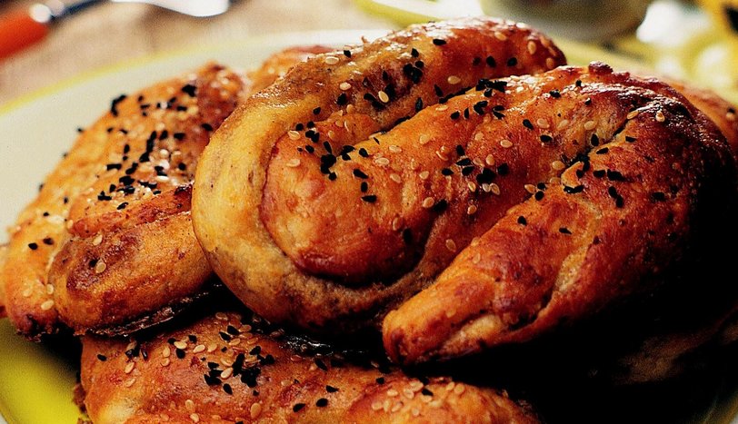 Diğer hamurları da bu şekilde hazırlayın. Yağlanmış fırın tepsisine tuz serpin. Lokumları aralıklı olarak koyun. 20 dakika tepside bekletin. Üzerine yumurta sarısı sürün. Çörek otu ve susam serpin. Önceden ısıtılmış 200 derece fırında üzeri iyice kızarana dek pişirin. Sıcak servis yapın.