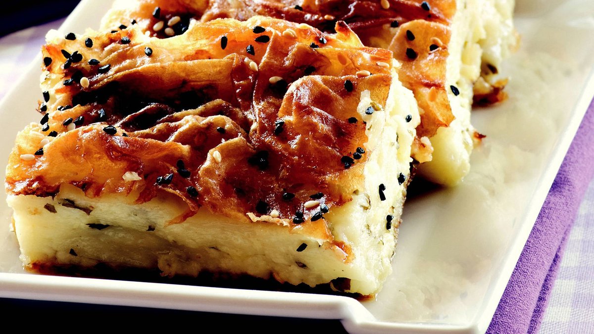 Yufkanın kenarlarını bir bıçağın tersiyle tepsinin kenarına sıkıştırın. Üzeri için yumurta sarısı ve ayçiçek yağı çırpıp böreğin üzerine sürün. Susam ve çörek otu serpin. Önceden ısıtılmış 180 derece fırında üzeri kızarana dek pişirin. Dilimleyerek servis yapın.